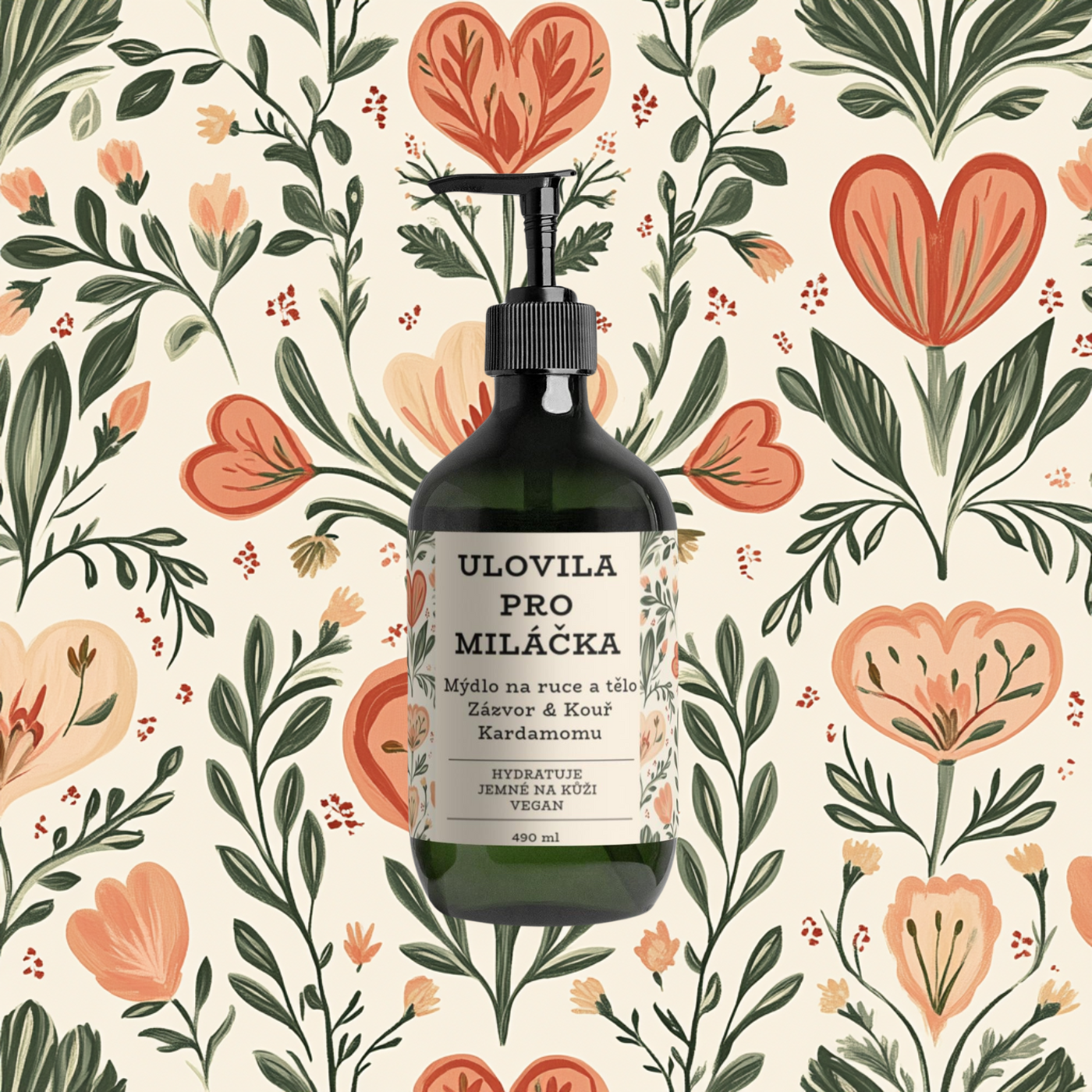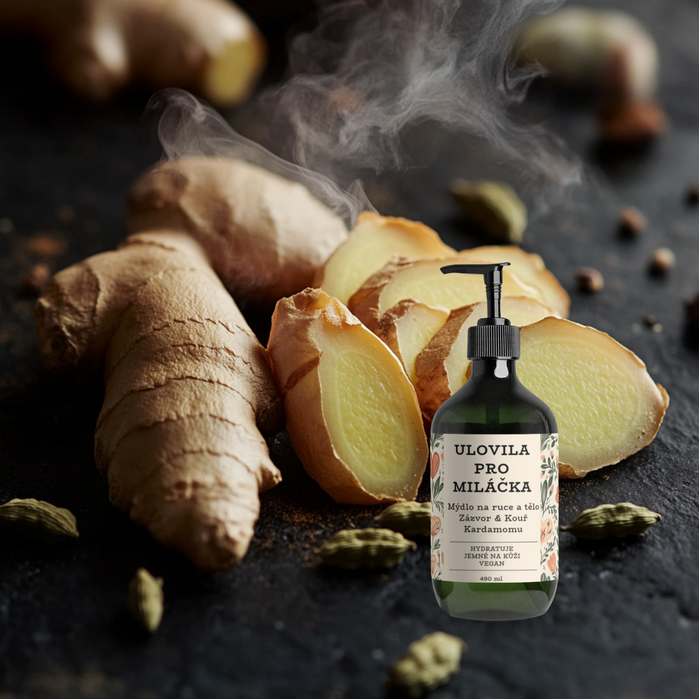 1x velké balení jemného a voňavého mýdla s pumpičkou Ulovila pro miláčka Zázvor & Kouř Kardamomu (490 ml)